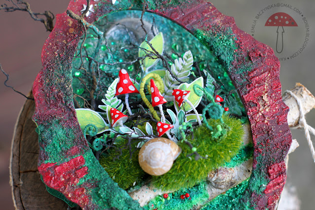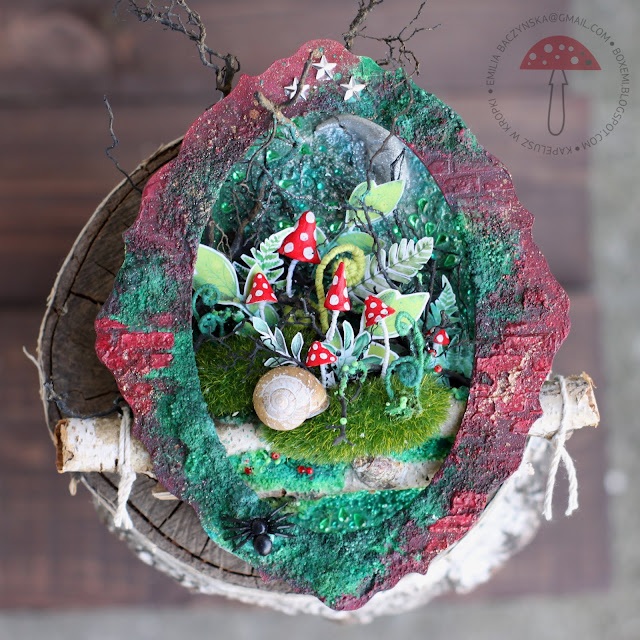Jako bazę użyłam HDFkę z Artistiko. Na tym materiale można robić warstwy i mediować do woli bez strachu, że coś się wygnie, zdeformuje, czy nie udźwignie ciężaru. Muchomorki oraz elf mają drucikowe kręgosłupy więc można je fajnie formować i wyginać. Zresztą elfika można odpiąć, zmienić mu pozycję, czy miejsce. Do stworzenia cegiełek wykorzystałam maskę od ITD Collection, od nich też są nadrukowane na folii skrzydełka, które od spodu podmalowałam farbą metaliczną zieloną oraz złotą. W tle świeci księżyc wyciśnięty z formeki Prima Finnabair Moulds gwiazdy i księżyce (to jedna z tych rzeczy, które tanie nie są, ale u mnie wyciski z tej foremki są w ciągłym użyciu). Nie brakuje tu też elementów naturalnych :)